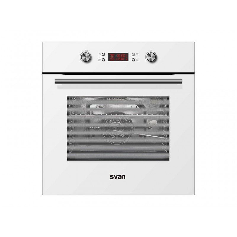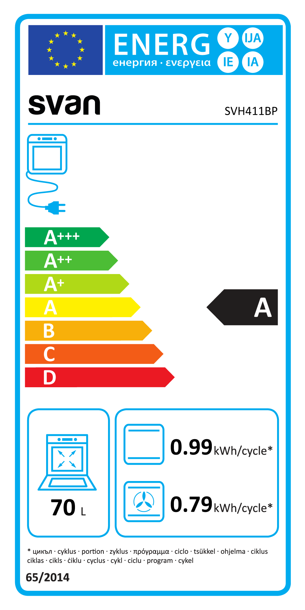 SVAN SVH411BP. Tamaño del horno: Medio, Tipo de horno: Horno eléctrico, Total capacidad interior, horno (s): 70 L. Tipo de control: Botones, Giratorio, Control de posición: Front / Top front. Tipo de reloj: Electrónico, Tipo de temporizador: Digital. Clase de eficiencia de energía: A, Escala de eficiencia energética: A+++ a D, Carga conectada: 3200 W. Cantidad de lámparas: 1 lámpara(s), Tipo de lámpara: Halógeno