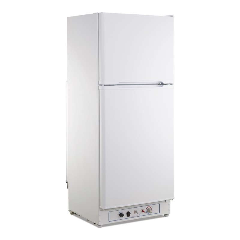 Frigorífico a gas en blanco. Nevera y congelador. Doble alimentación, se puede conectar a gas butano o a electricidad. Patas ajustables y apertura de puertas intercambiables, a derecha o a izquierda.