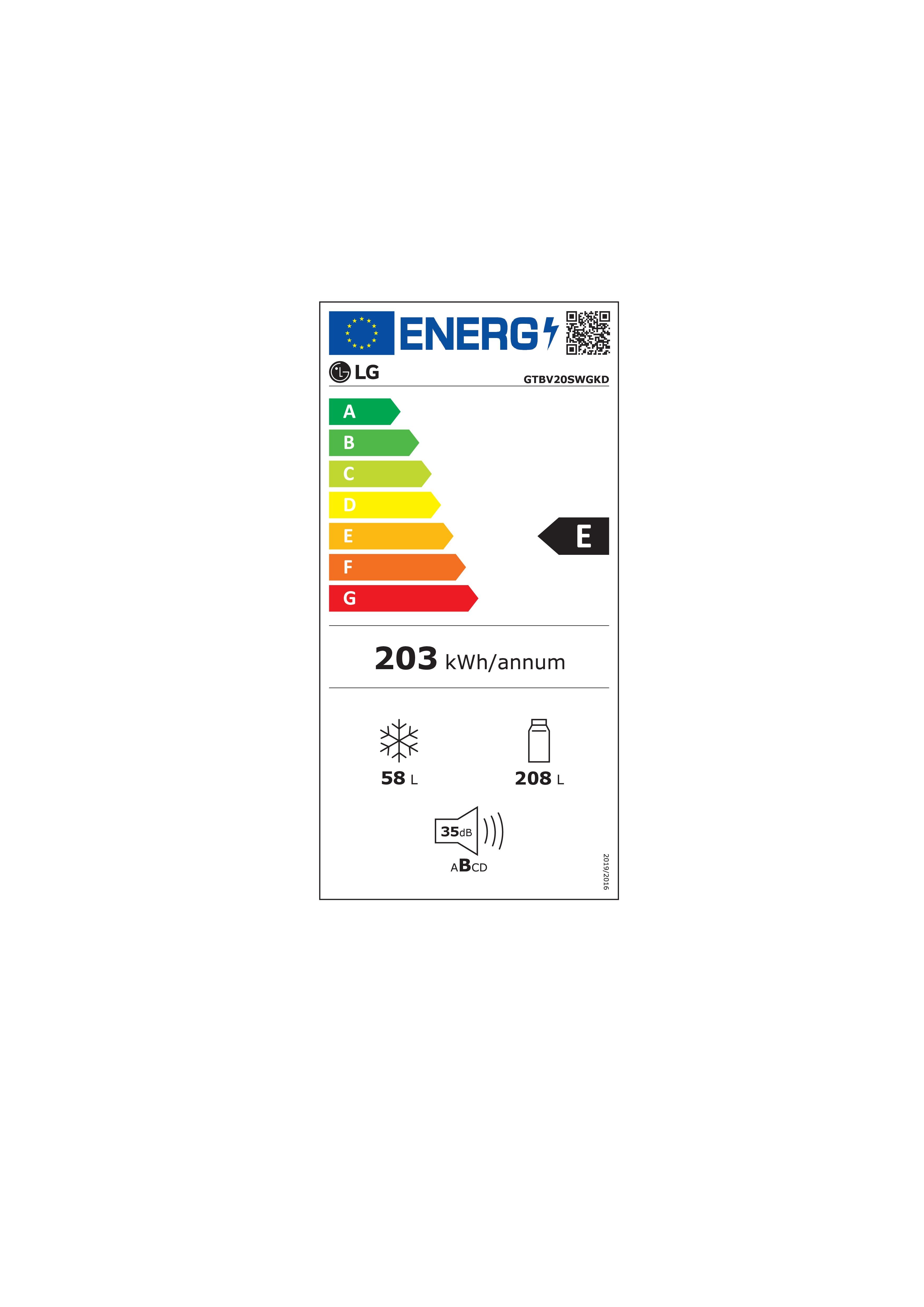 LG GTBV20SWGKD. Capacidad neta total: 266 L, Clase climática: SN-T, Nivel de ruido: 35 dB. Frigorífico, capacidad neta: 208 L, Sistema multi-flujo de aire (nevera), Luz interior de la nevera, Frigorífico, número de compartimentos: 4, Número de compartimientos para verduras: 1. Congelador, capacidad neta: 58 L, Capacidad de congelación: 2,8 kg/24h. Clase de eficiencia de energía: E, Consumo de energía anual: 203 kWh. Color del producto: Blanco