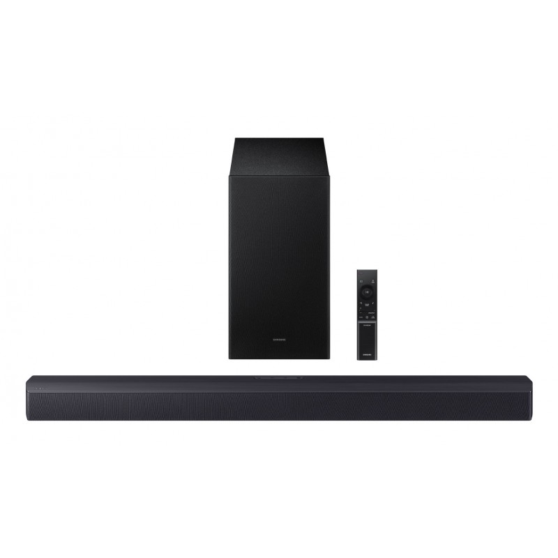 Samsung B-Series Barra de sonido B450F Serie B 2.1 con Subwoofer y Dolby 2.0 2025. Canales de salida de audio: 2.1 canales, Decodificadores incorporados: DTS Virtual:X, Dolby 2.0, Dolby Audio, Modos de ecualización: Adaptive Lite, Refuerzo de graves, Game Pro, Estándar, Expansión de sonido envolvente. Conectividad del altavoz de subgraves (subwoofer): Inalámbrico. Color del producto: Negro, Nombre del color: Titan Black, Formatos de audio soportados: AAC, AIFF, FLAC, MP3, OGG, WAV. Tecnología de conectividad: Inalámbrico y alámbrico. Consumo eléctrico de la barra de sonido: 25 W, Consumo de energía del altavoz potenciador de graves: 40 W, Consumo de energía (inactivo): 0,5 W