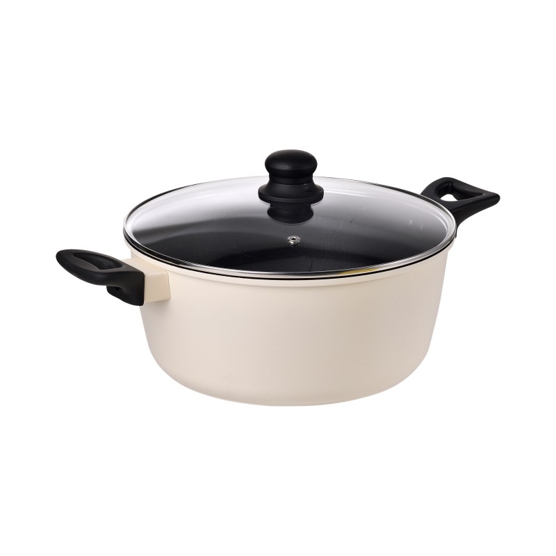Cacerola con tapa de 28 cm fabricada en aluminio forjado con revestimiento multicapa libre de PFOA. Ofrece una cocción uniforme, gran resistencia a la corrosión y asas de tacto suave. Apta para todo tipo de cocinas, incluida inducción.