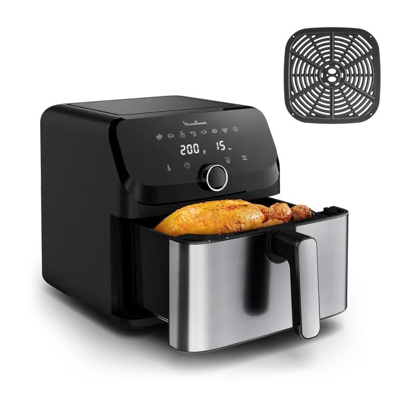 Moulinex Easy Fry Mega EZ855D20. Tipo de producto: Freidora de aire caliente, Capacidad: 7,5 L, Temperatura (min): 80 °C. Tipo de construcción: Sencillo, Color del producto: Negro, Acero inoxidable, Tipo de control: Giratorio, Tocar. Tipo de visualizador: LCD. Ancho: 310 mm, Profundidad: 396 mm, Altura: 315 mm