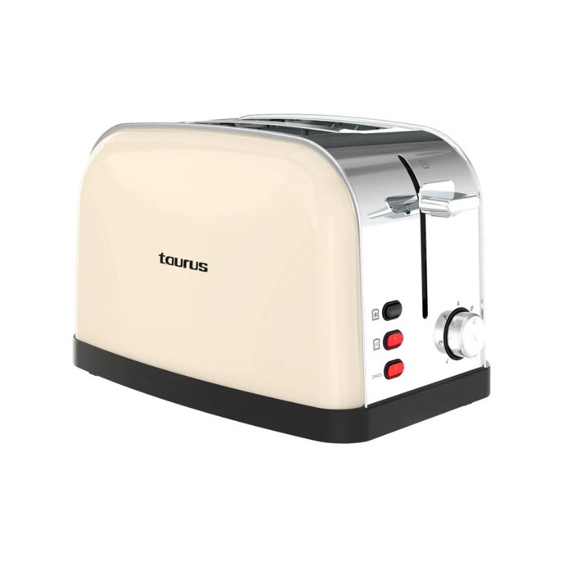 Tostadora Taurus Vintage II Cream, con diseño retro en acero inoxidable y acabado coral. Ofrece 950 W de potencia, dos ranuras cortas con centrado automático y funciones de descongelar, recalentar y cancelar. Combina estética vintage y un tostado uniforme en cada uso.