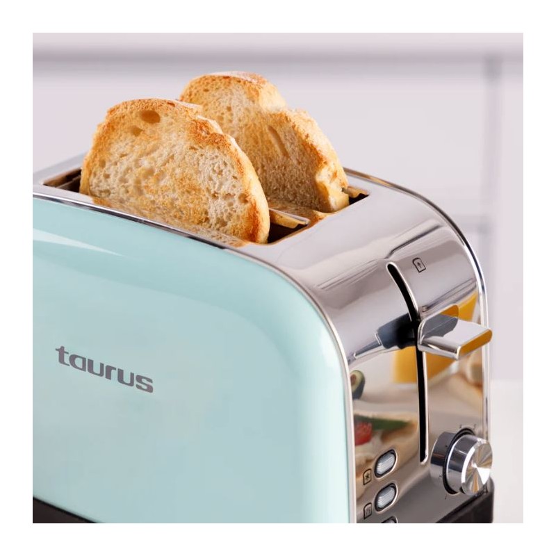 Tostadora Taurus Vintage II Mint, con diseño retro en acero inoxidable y acabado mint. Ofrece 950 W de potencia, dos ranuras cortas con centrado automático y funciones de descongelar, recalentar y cancelar. Combina estética vintage y un tostado uniforme en cada uso.