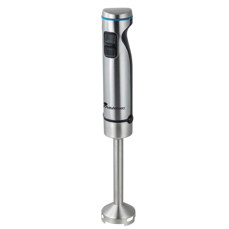 La batidora de mano MasterPRO Foodies ofrece un rendimiento potente gracias a sus 1200 W, capaces de procesar alimentos con rapidez y precisión. Su control de velocidad variable, situado en la parte superior, permite ajustar la potencia según cada preparación, mientras que la función Turbo proporciona un impulso extra cuando es necesario. Incorpora una luz LED azul que indica su funcionamiento y un agarre ergonómico y elegante que garantiza comodidad durante el uso. Su varilla de acero inoxidable resistente asegura durabilidad y resultados homogéneos. Una herramienta imprescindible para cocinar con eficiencia y estilo.