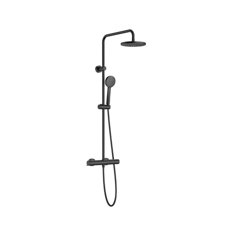 Columna termostática para ducha de la colección Victoria Basic / T-Basic de Roca, en acabado negro mate. Incluye rociador superior de 200 mm, ducha de mano de 100 mm de una función, flexible metálico de 1,7 m y soporte móvil.