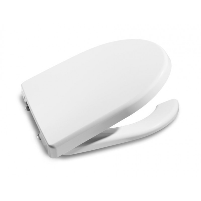 Tapa y asiento para inodoro de Roca con apertura frontal diseñada para acceso cómodo y fácil limpieza. Bisagras de acero inoxidable para mayor resistencia.