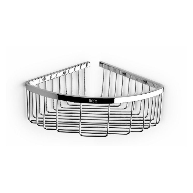 Contenedor de esquina de la serie Hotels 2.0 de Roca, fabricado en metal con acabado cromado brillante. Diseñado para aprovechar espacios angulares en baños, ofrece una solución práctica y estética para guardar jabones, esponjas u otros objetos de higiene.