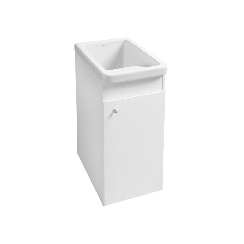 Conjunto práctico de mueble base y lavadero para baños, perteneciente a la serie Henares de Roca. El lavadero integra una pila de porcelana blanca brillante y el mueble cuenta con una puerta batiente reversible, proponiendo un diseño compacto y funcional ideal para espacios reducidos.