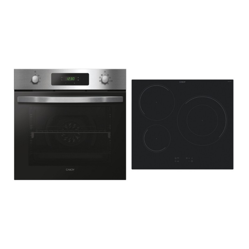 Conjunto de horno multifunción eléctrico y placa de inducción diseñado para integración en cocina. El horno ofrece múltiples funciones de cocción y sistemas de limpieza avanzados. La placa de inducción dispone de tres zonas de cocción con niveles de potencia ajustables y funciones de seguridad.