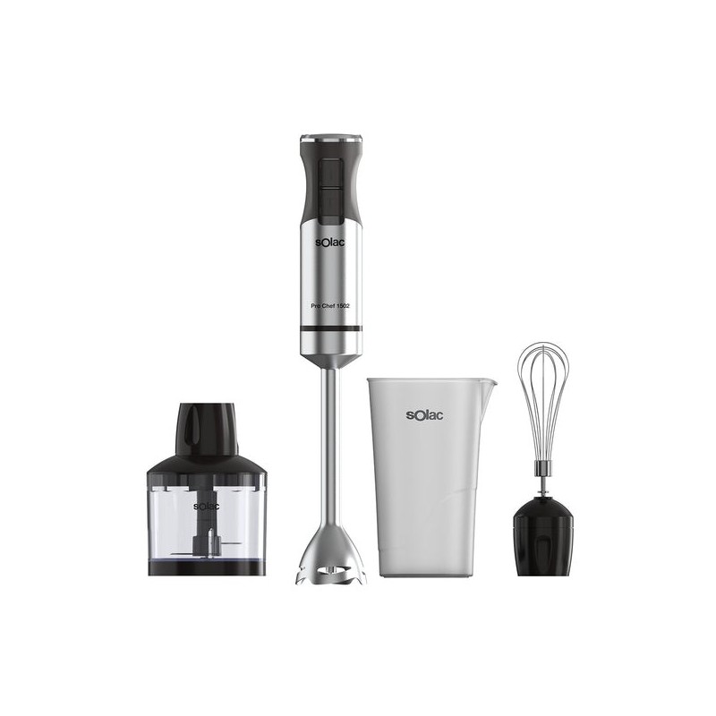 Solac Pro Chef 1502. Tipo: Batidora de vaso portátil, Color del producto: Negro, Acero inoxidable, Longitud del cable: 1,15 m. Capacidad de jarra: 0,7 L, Capacidad del tazón de molido: 0,35 L. Material del eje: Acero inoxidable, Material de la cuchilla: Acero inoxidable, Material de las jarras: Plástico. Potencia: 1500 W, Fuente de energía: Corriente alterna, Voltaje de entrada AC: 220 - 240 V. Ancho: 60 mm, Profundidad: 80 mm, Altura: 400 mm