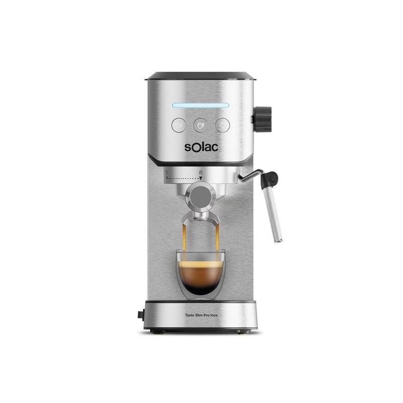 La cafetera espresso Taste Slim Pro Inox de Solac incorpora un avanzado sistema Thermoblock, que calienta el agua al instante con temperatura precisa y constante, asegurando un café más sabroso, rápido y con menor consumo energético. Con 20 bares de presión, permite preparar una o dos tazas con parada automática y ofrece 4 funciones: espresso, doble espresso, agua caliente y vapor. Incluye vaporizador, calienta tazas y cuerpo en acero inoxidable. ¡Todo lo que necesitas para un espresso perfecto en casa!