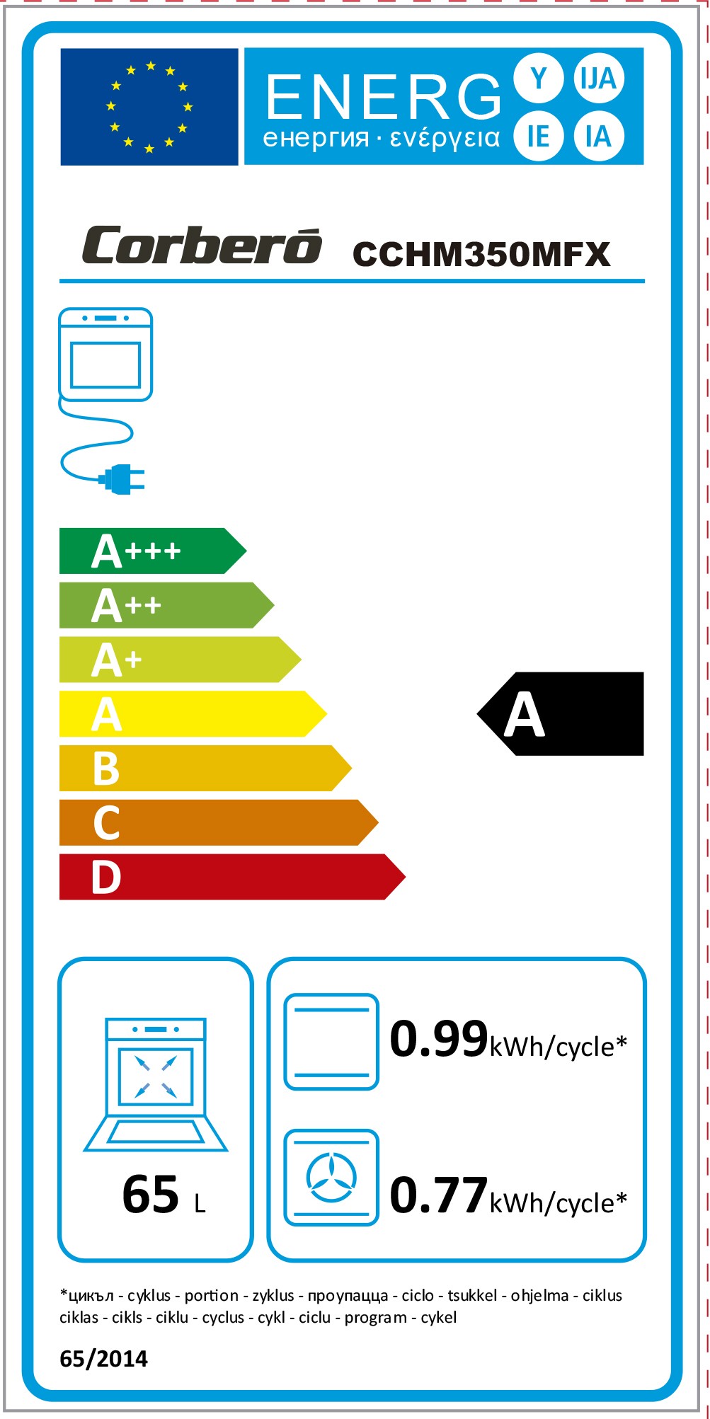 Corbero CCHM350MFX. Tamaño del horno: Medio, Tipo de horno: Horno eléctrico, Total capacidad interior, horno (s): 65 L. Tipo de instalación: Integrado, Color del producto: Negro, Acero inoxidable, Tipo de control: Giratorio. Tipo de temporizador: Digital. Clase de eficiencia de energía: A, Consumo de energía (convencional): 0,99 kWh, Consumo de energía (convección forzada): 0,77 kWh. Ancho: 595 mm, Profundidad: 575 mm, Altura: 595 mm