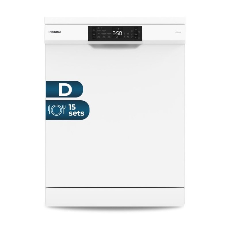 Hyundai HJ15600DD. Tipo de instalación: Independiente, Talla del producto: Tamaño completo (60 cm), Color de la puerta: Blanco. Número de cubiertos: 15 cubiertos, Clase de emisión de ruido: B, Nivel de ruido: 42 dB. Clase de eficiencia de energía: D, Consumo de agua por ciclo de lavado: 9 L, Consumo de energía por 100 ciclos: 86 kWh. Ancho: 598 mm, Profundidad: 598 mm, Altura: 850 mm. Volumen del paquete: 0,37 cm³, Ancho del paquete: 644 mm, Profundidad del paquete: 661 mm