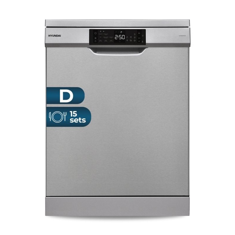 Hyundai HJ15600DDX. Tipo de instalación: Independiente, Talla del producto: Tamaño completo (60 cm), Color de la puerta: Acero inoxidable. Número de cubiertos: 15 cubiertos, Clase de emisión de ruido: D, Nivel de ruido: 42 dB. Clase de eficiencia de energía: D, Consumo de agua por ciclo de lavado: 9 L, Consumo de energía por 100 ciclos: 86 kWh. Ancho: 598 mm, Profundidad: 598 mm, Altura: 850 mm