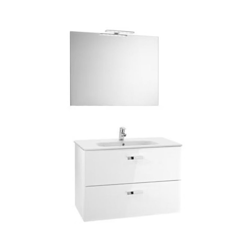 Pack - Conjunto de mueble base de dos cajones, lavabo, espejo y aplique LED Start light. Sifón no incluido. No incluye grifería.
